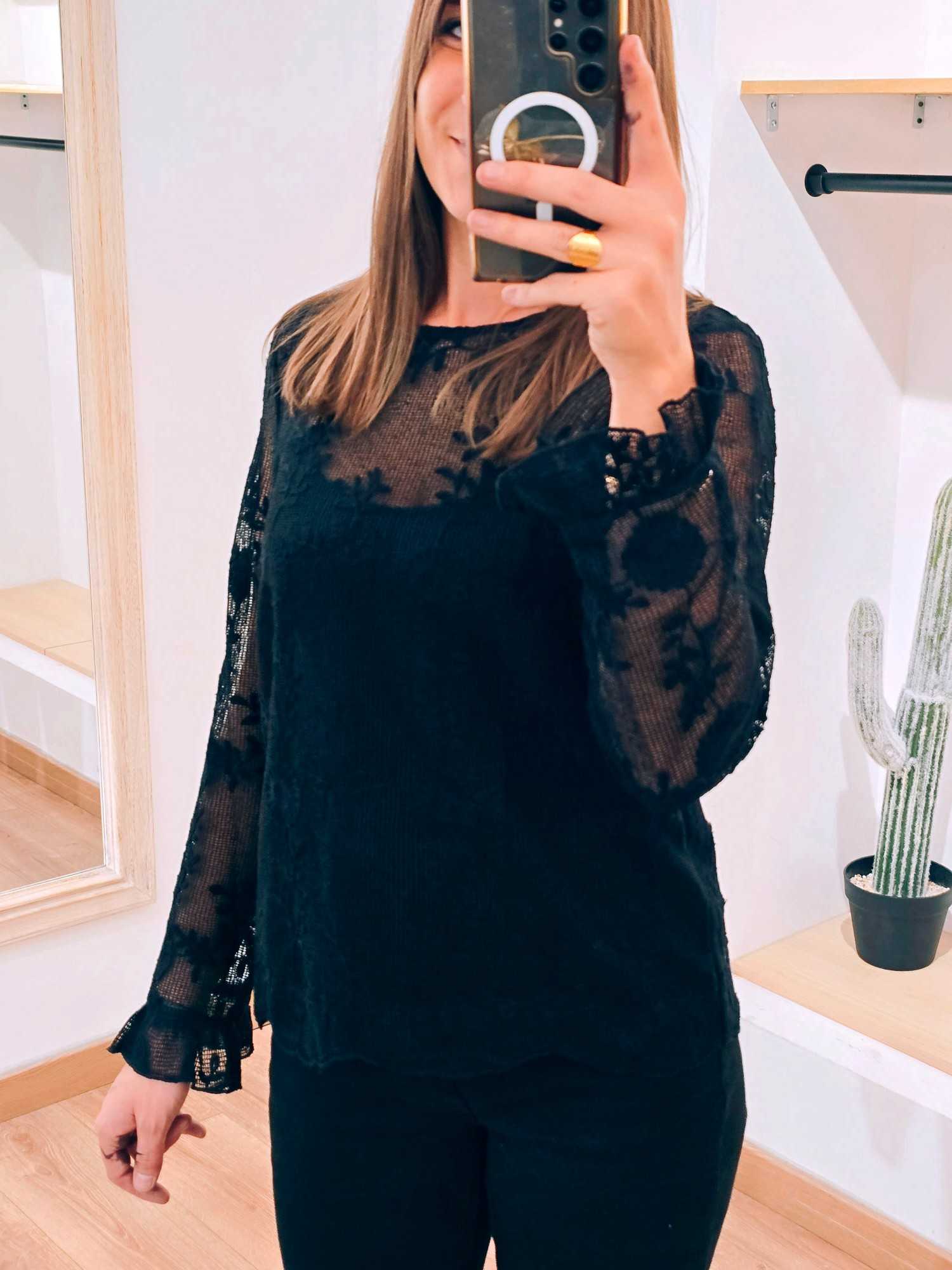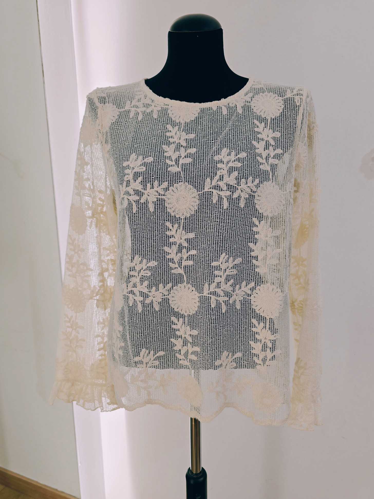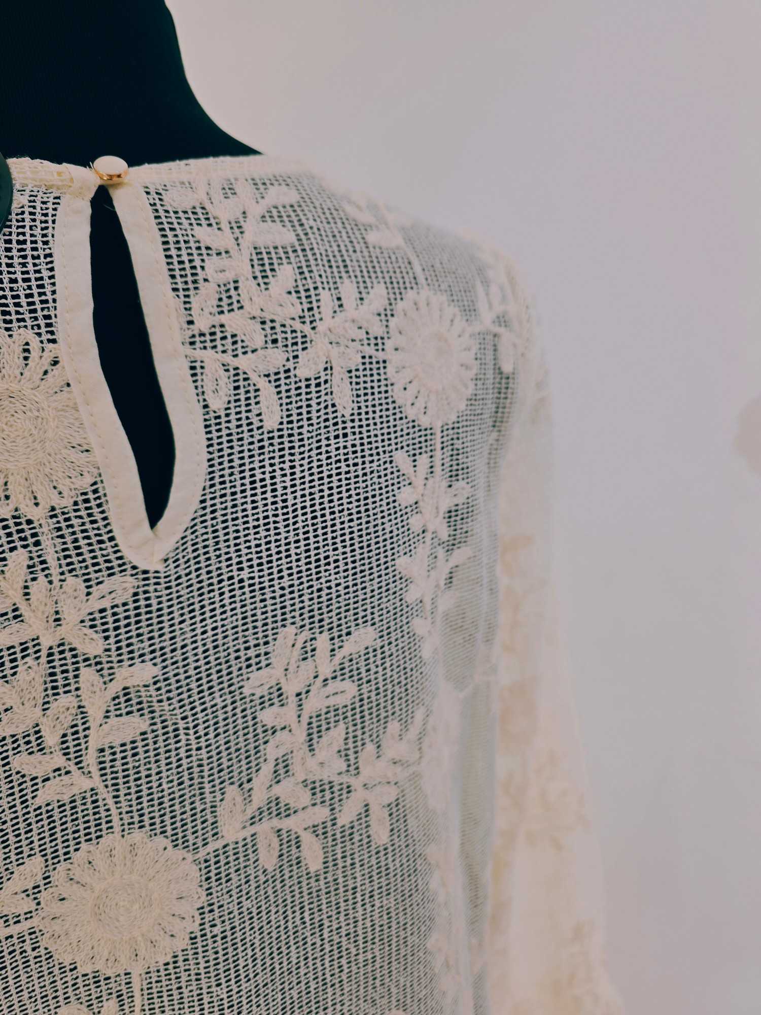 Une blouse délicate et texturée qui apporte un charme naturel à chaque tenue. – dentelle ajourée effet filet – broderies florales fines – poignets volantés – coupe fluide féminine