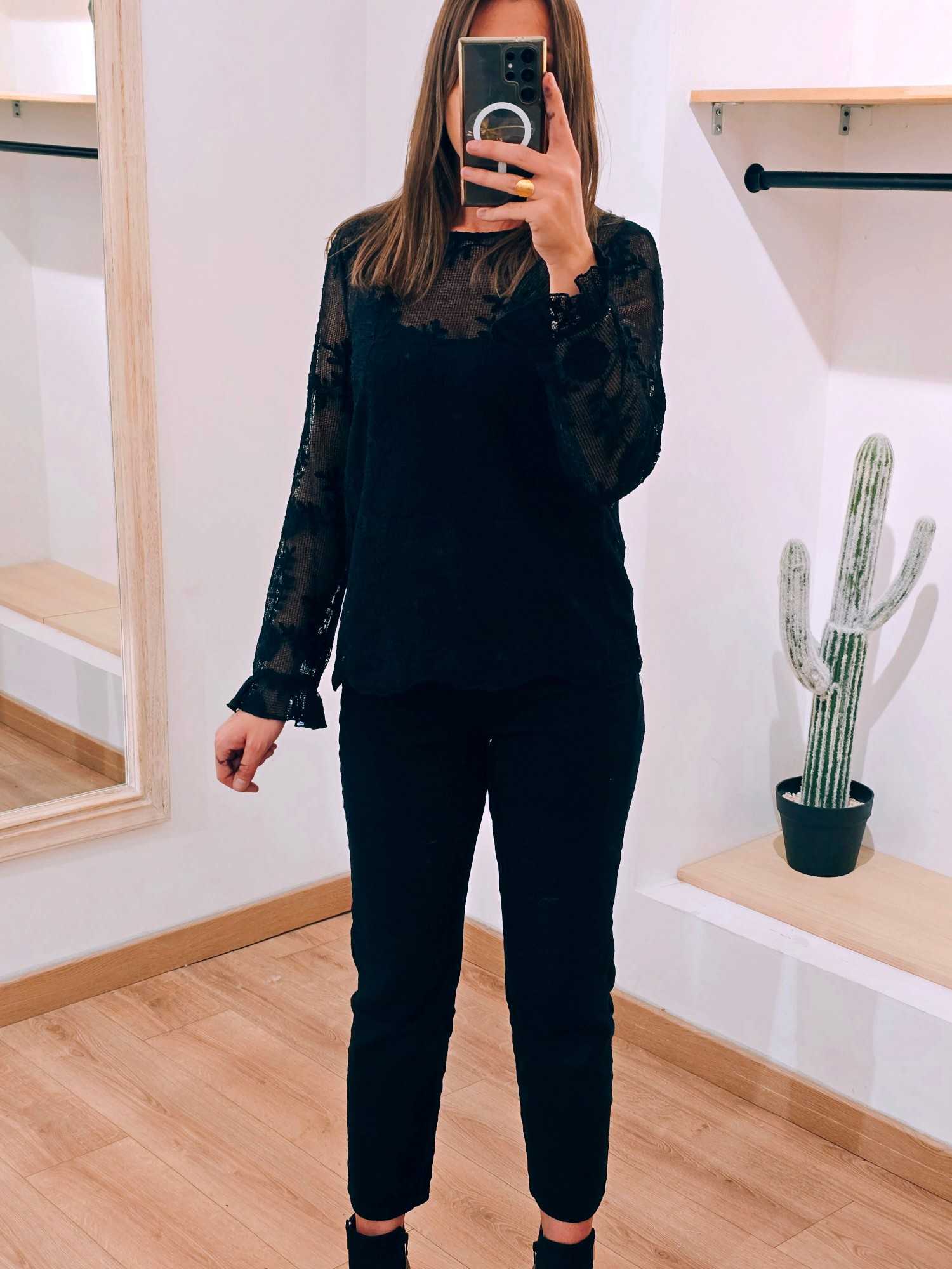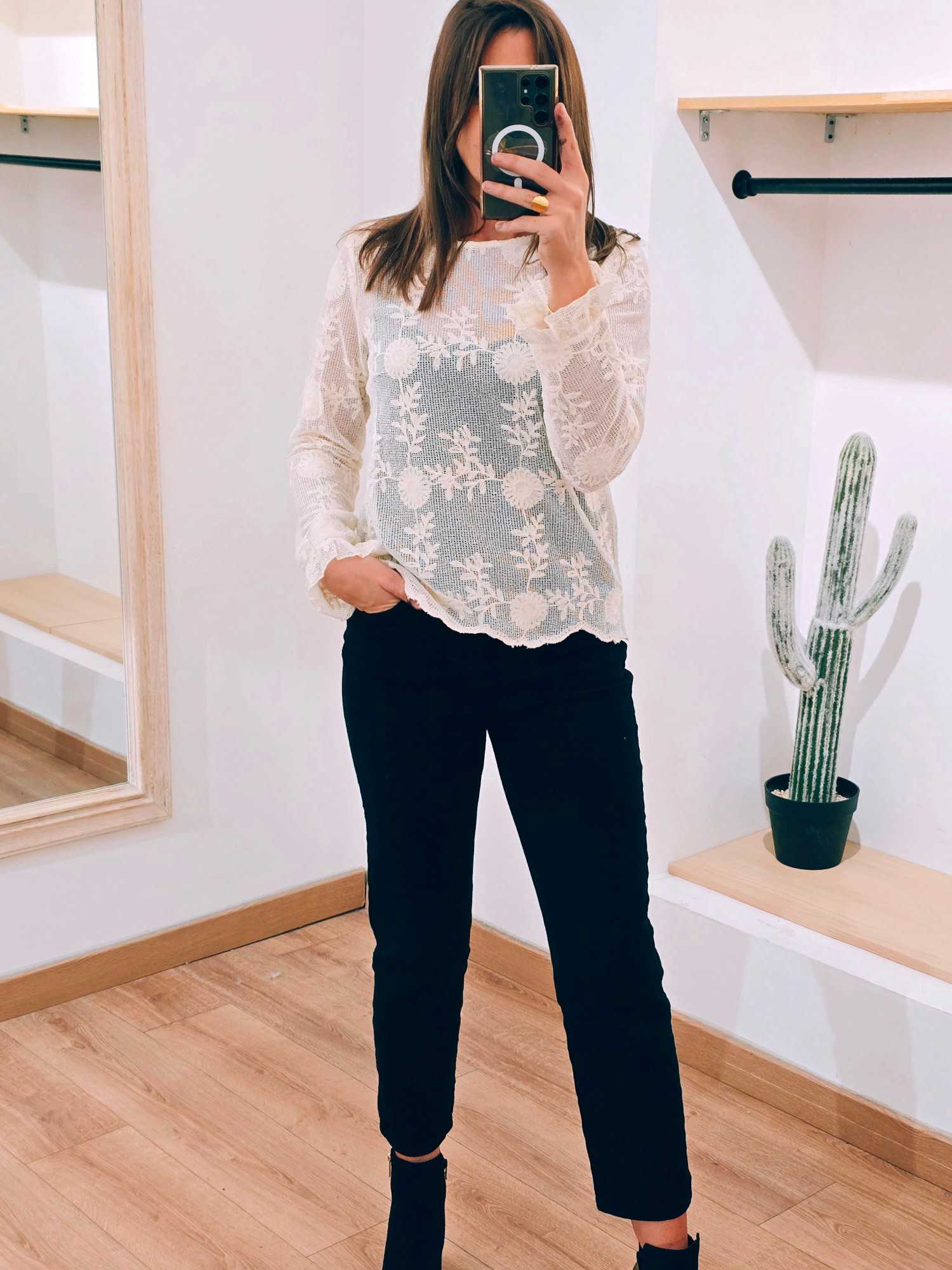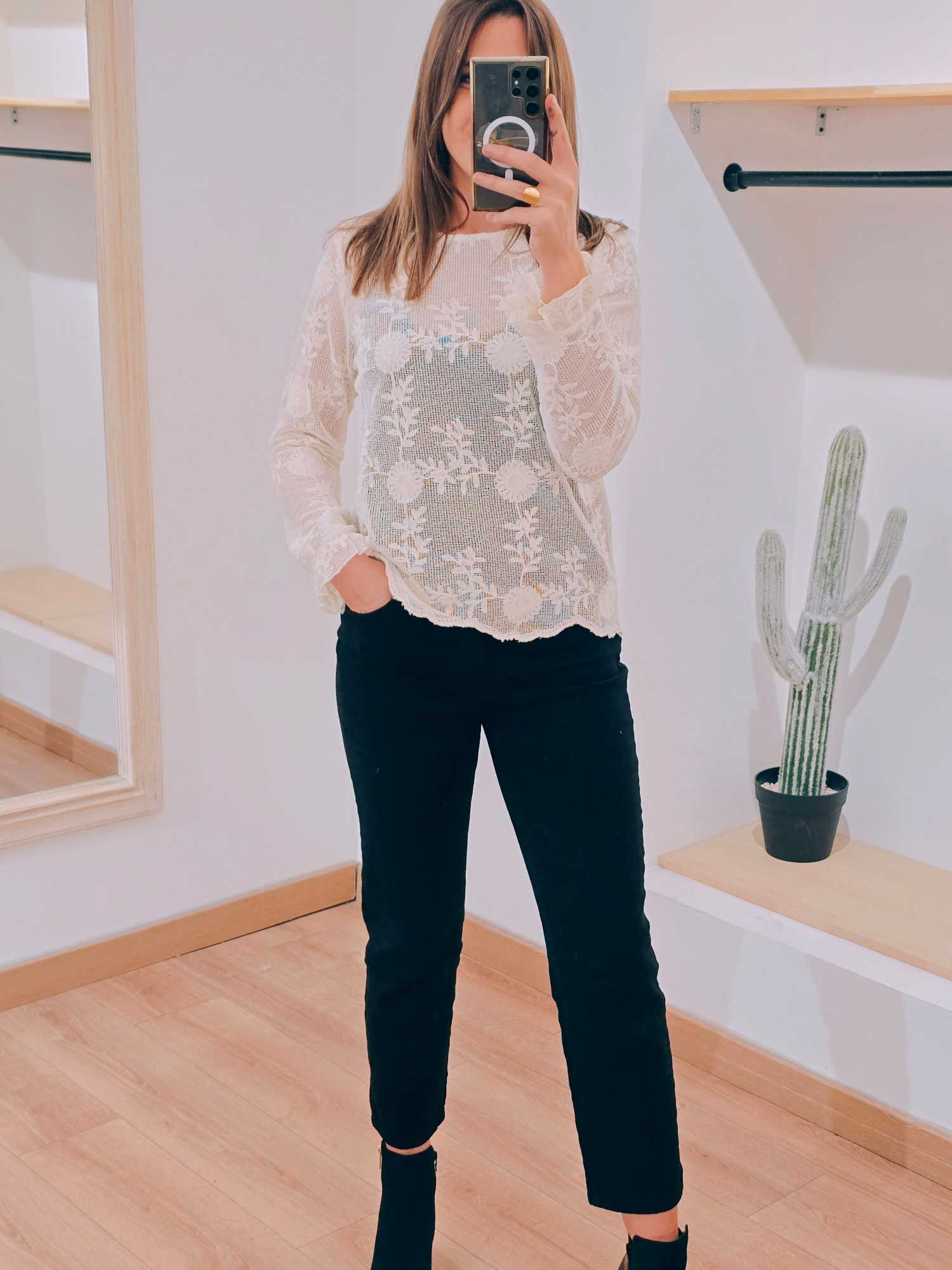 Une blouse délicate et texturée qui apporte un charme naturel à chaque tenue. – dentelle ajourée effet filet – broderies florales fines – poignets volantés – coupe fluide féminine