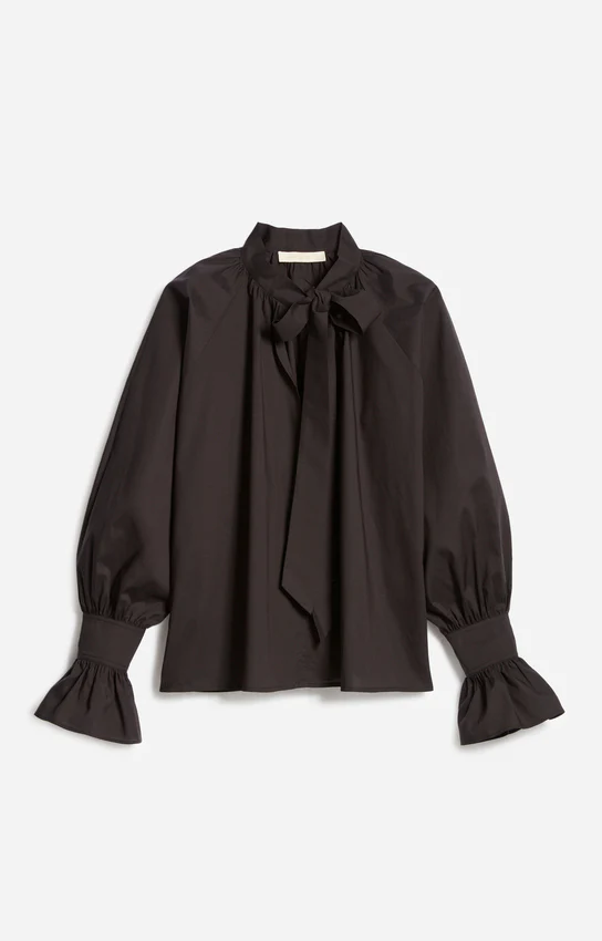 Blouse Vanessa Bruno. Volume revisité pour une silhouette raffinée, alliant fluidité et sophistication, en popeline de coton impeccable. Blouse fluide à col lavallière Manches longues évasées avec poignets boutonnés Fermeture boutonnée discrète sur le devant Panneau froncé au dos Réf. 4EVA69-V09816