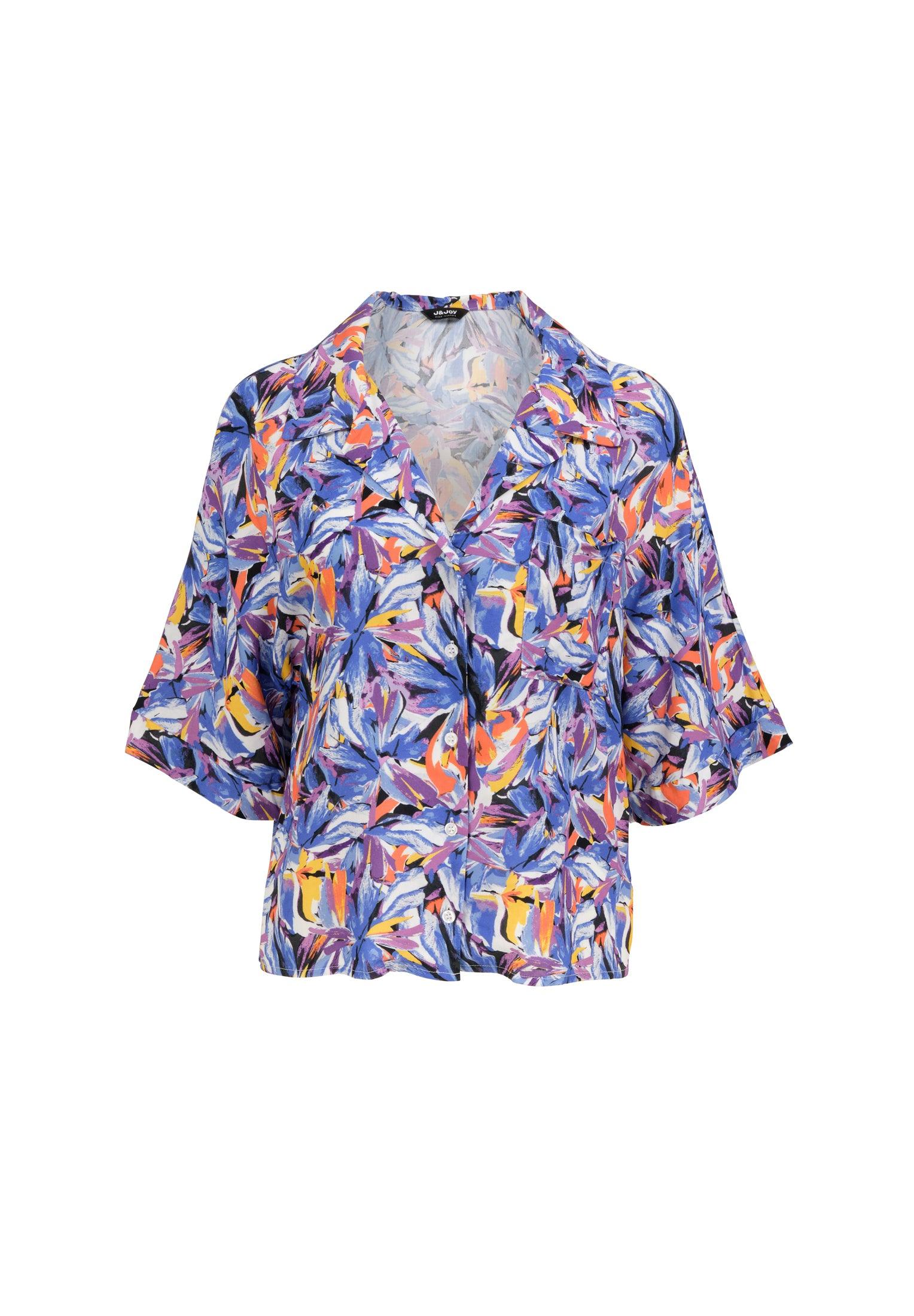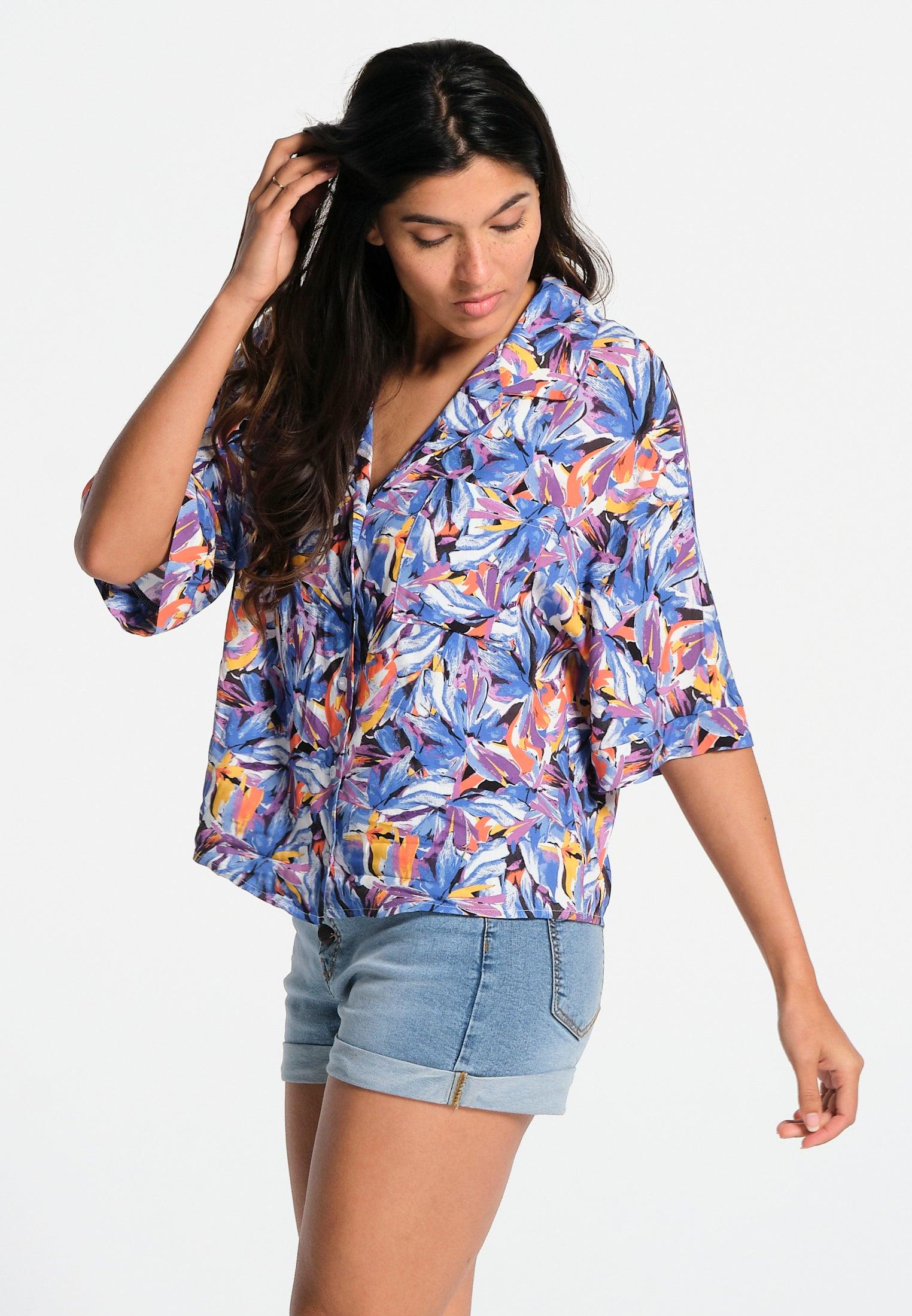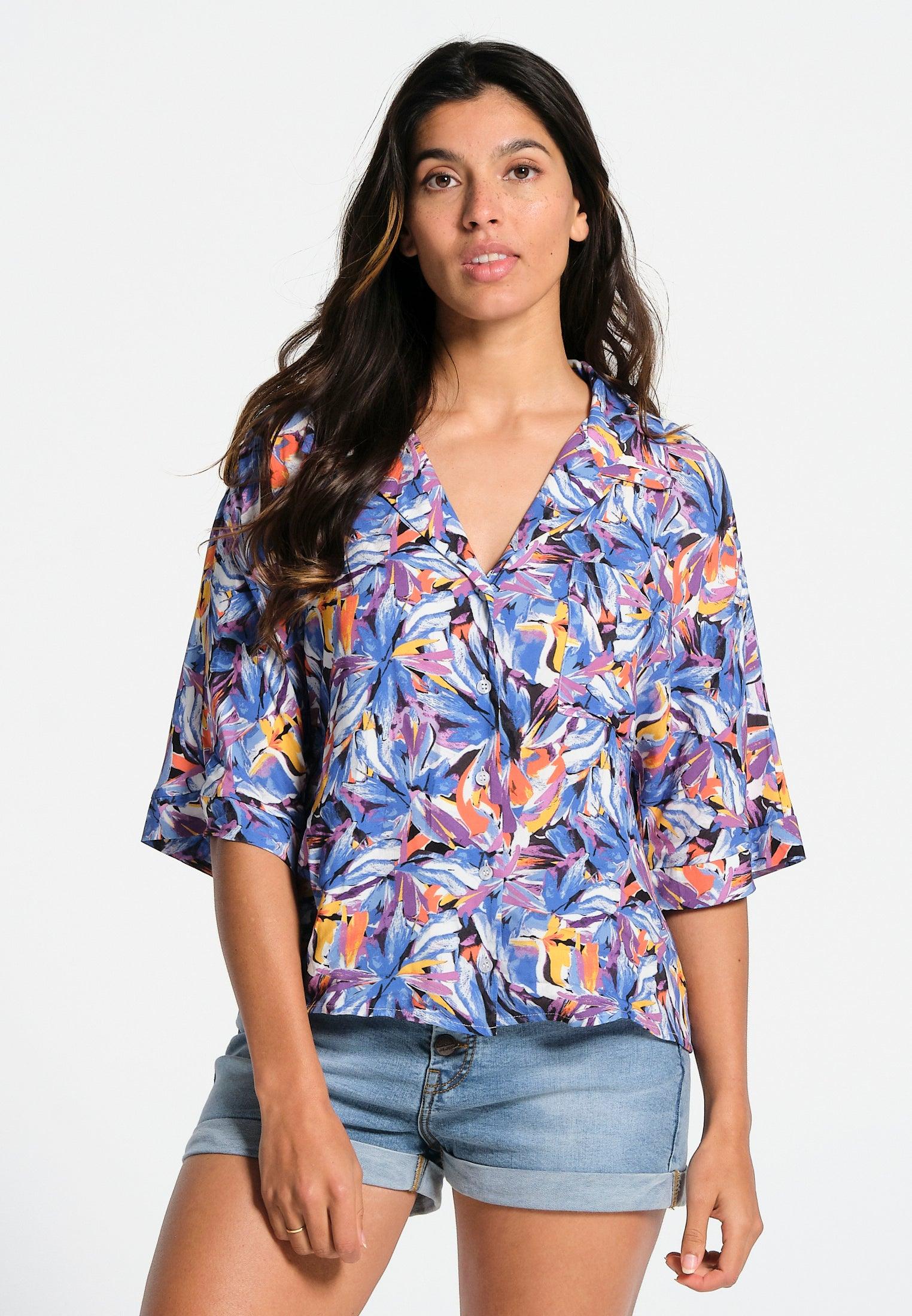 Un vent de légèreté souffle sur cette chemise à manches courtes tombantes. La forme du col est en V. La fermeture est boutonnée à l’avant. Elle possède une poche poitrine. L’imprimé représente des fleurs multicolores abstraites. Un modèle doux et joyeux, qui trouvera sans aucun doute, sa place dans votre garde-robe.