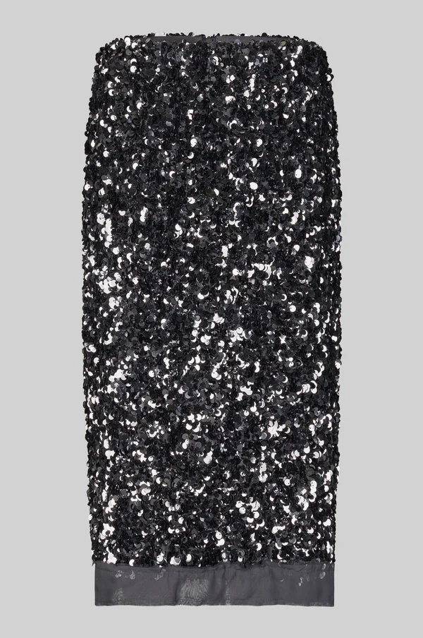 Jupe crayon à sequins de la marque Second Female. Elle est ornée de sequins de différentes tailles sur un fond ton sur ton et d’une ceinture élastiquée recouverte. Doublure visible à l’ourlet. Fente sur un côté. Entièrement doublée. Coupe ajustée et droite.