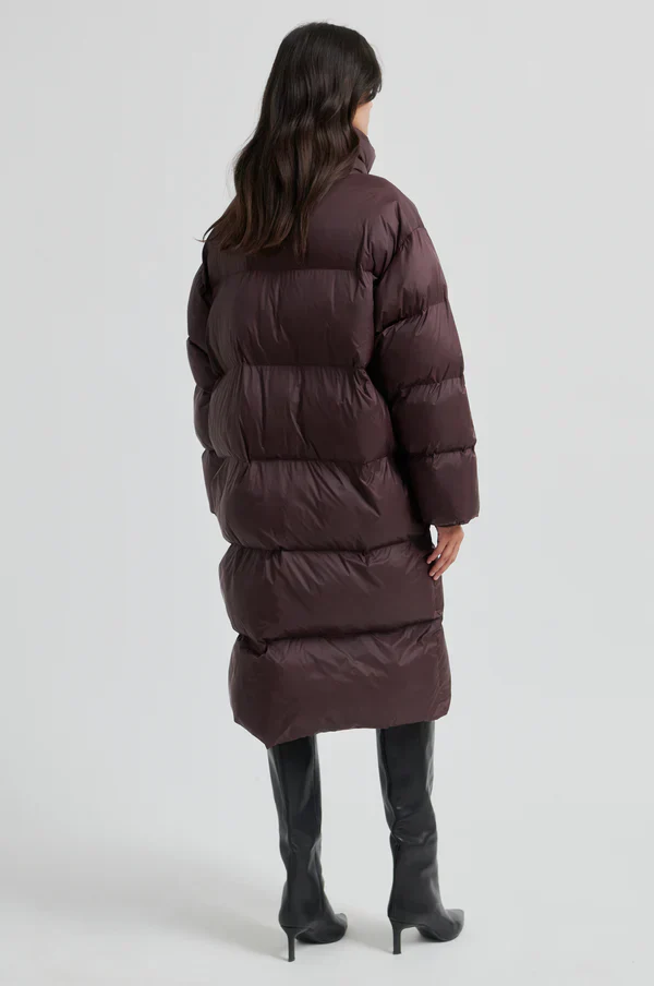 Doudoune longue de la marque Second Female. Confectionnée en tissu lisse avec rembourrage matelassé, elle présente un col montant, une fermeture éclair à double curseur avec protège-zip et deux poches latérales.