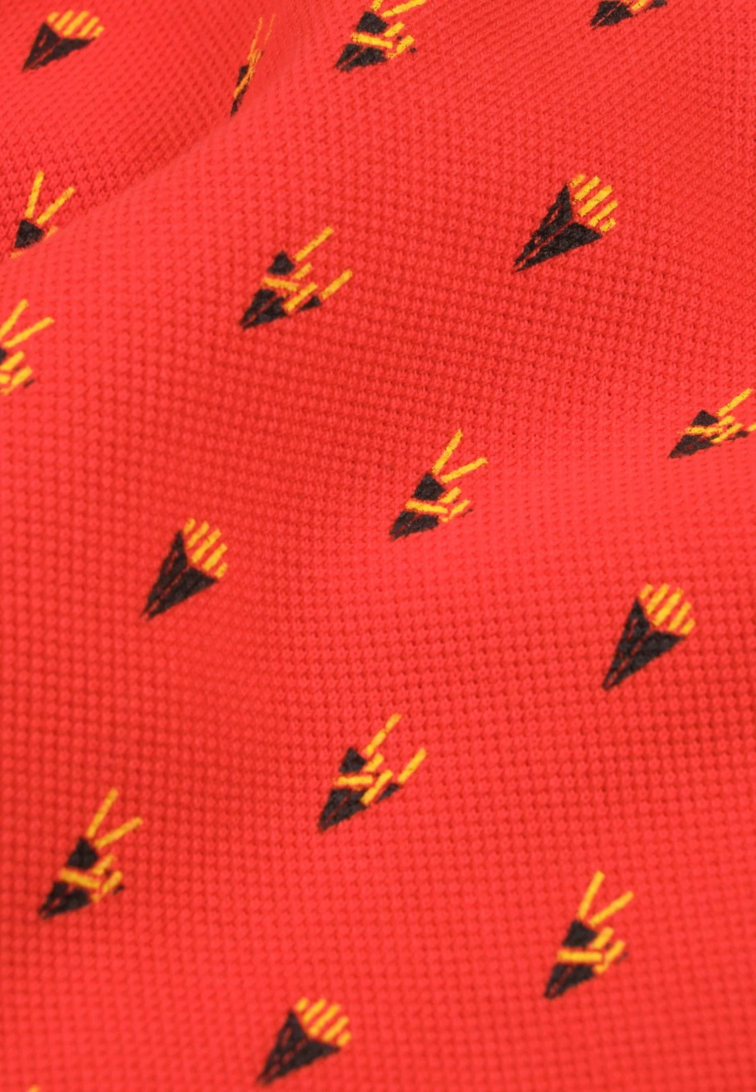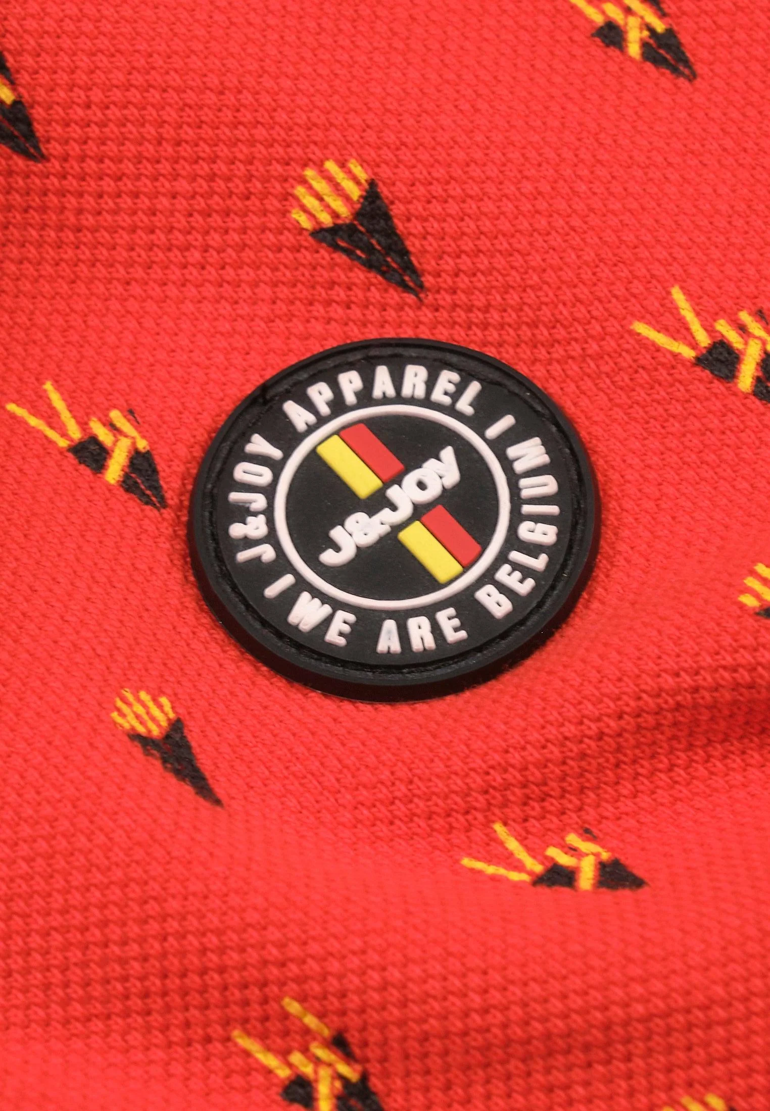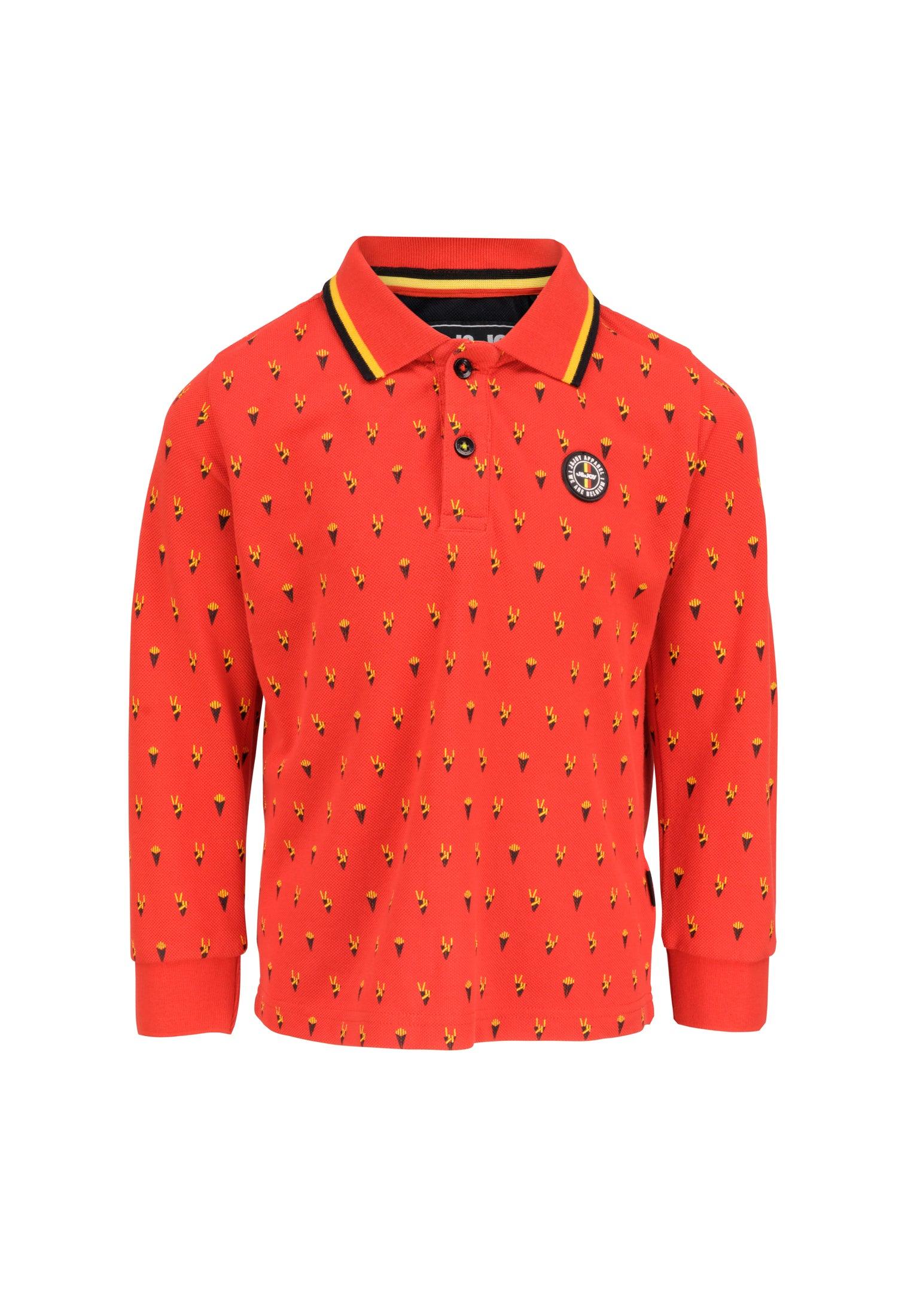 Polo longues manches arborant la couleur rouge du drapeau belge, synonyme de courage. Le col et le bas des manches sont côtelés avec un liseré contrasté. La coupe est droite et présente un logo sur la poitrine. On adore l’imprimé frites, une bonne dose d’humour à la belge