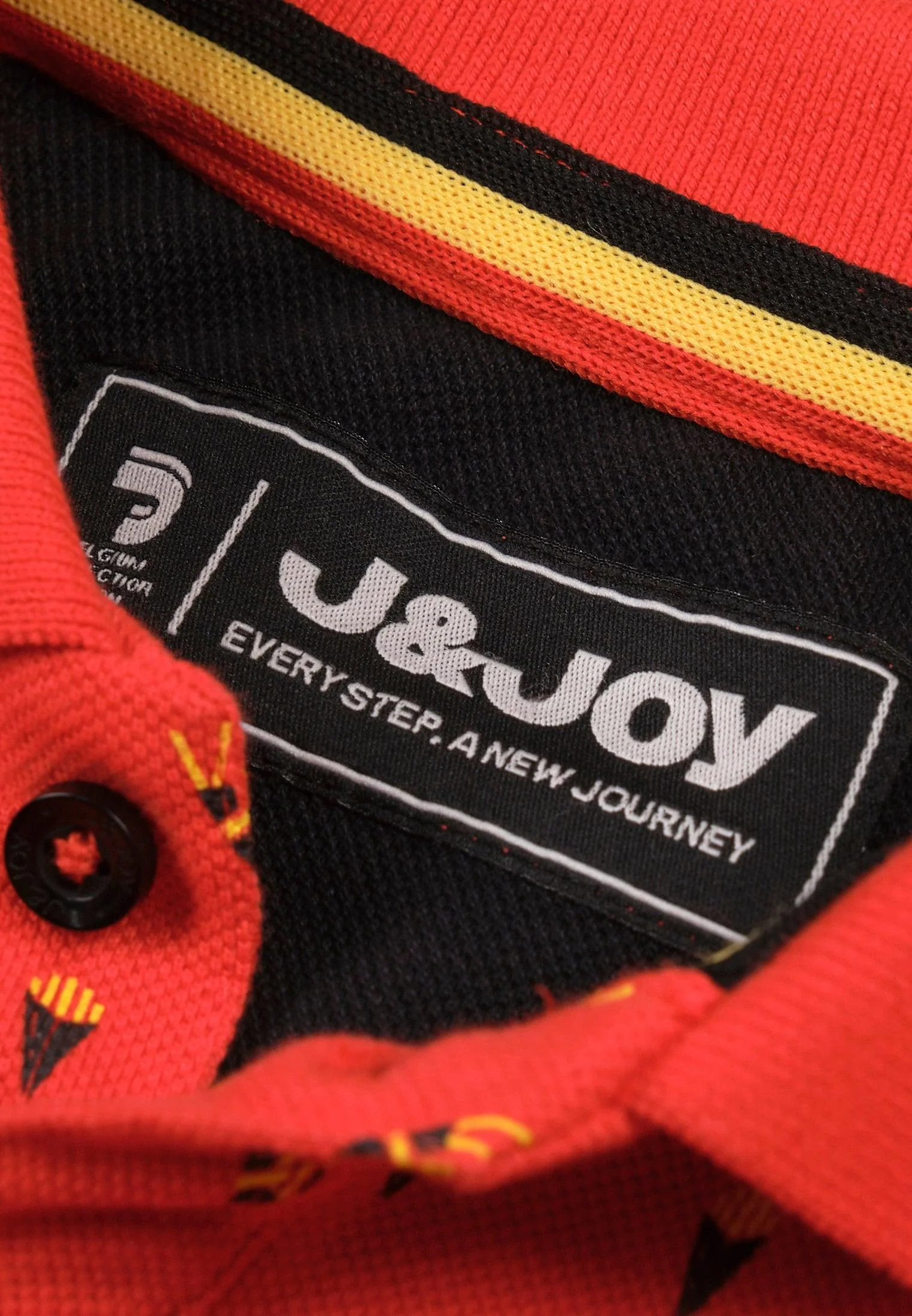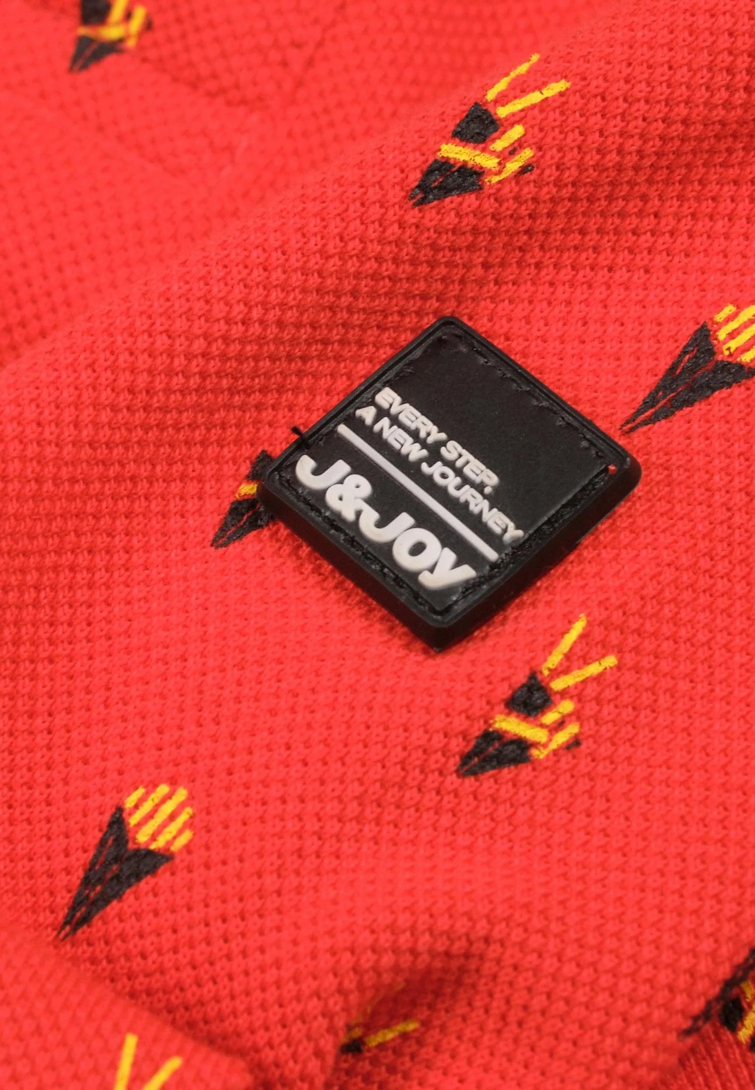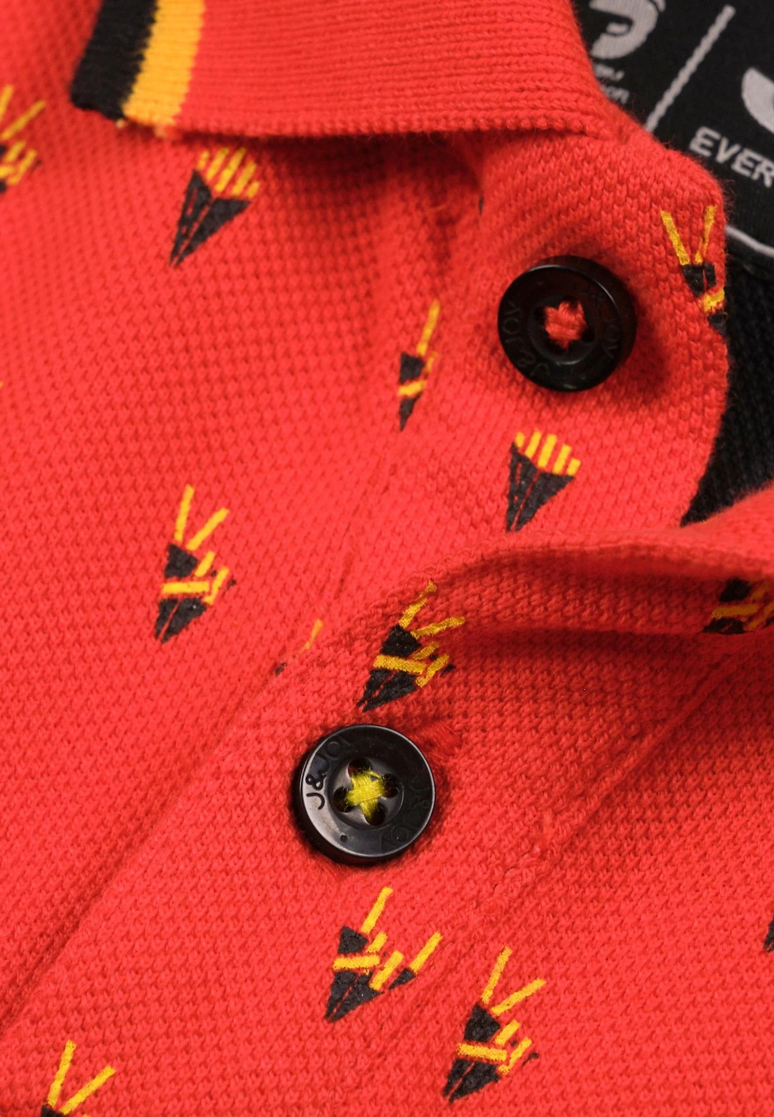 Polo longues manches arborant la couleur rouge du drapeau belge, synonyme de courage. Le col et le bas des manches sont côtelés avec un liseré contrasté. La coupe est droite et présente un logo sur la poitrine. On adore l’imprimé frites, une bonne dose d’humour à la belge
