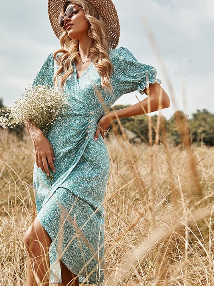 Robe imprimée fleurie plissée à col en V pour femmes