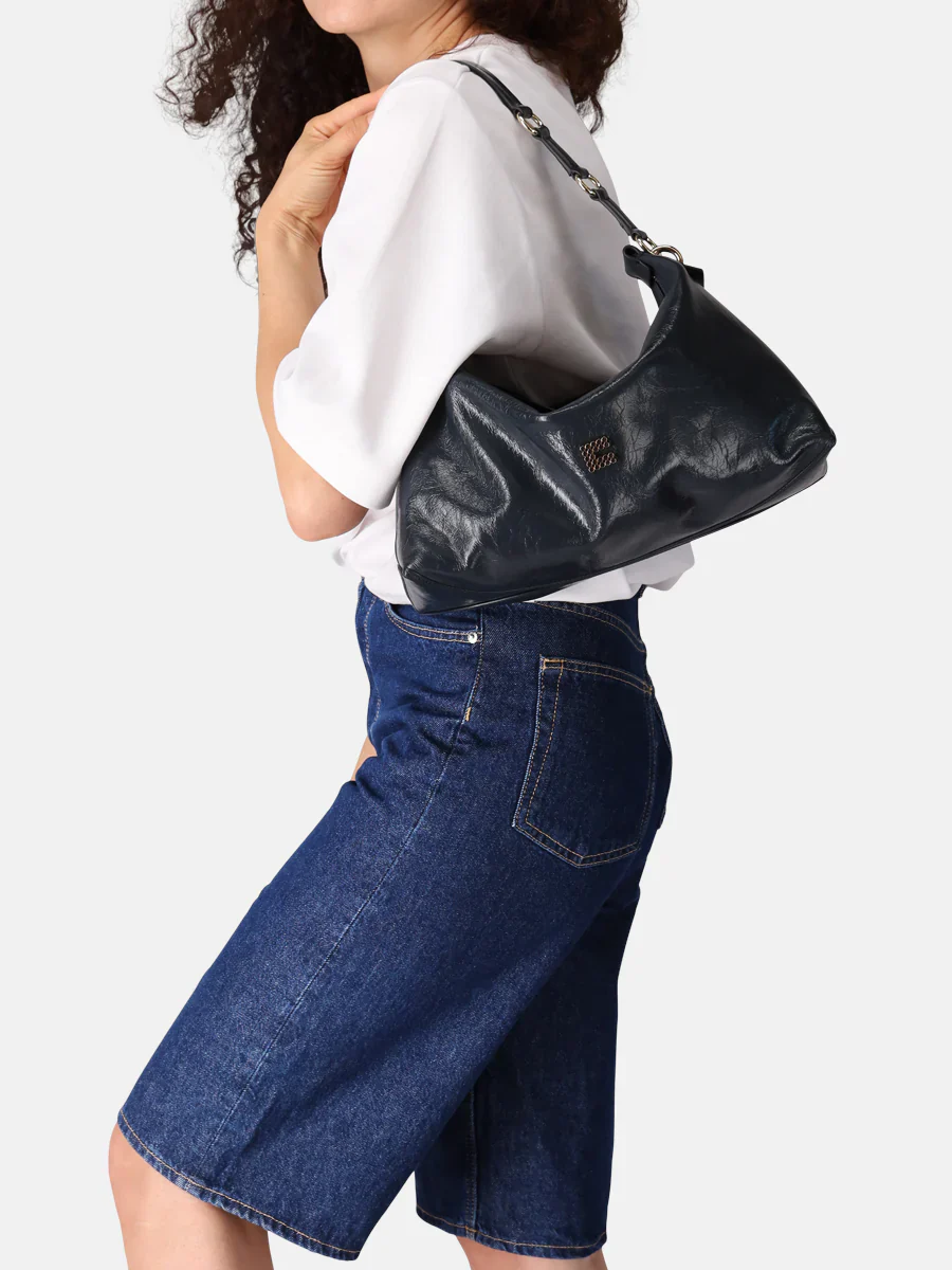Suffisamment spacieux pour accueillir vos essentiels tout en conservant une silhouette élégante et structurée, il se porte à la main grâce à sa poignée supérieure intégrée ornée d’un discret anneau métallique, ou en bandoulière ou à l’épaule grâce à sa bandoulière amovible et réglable.