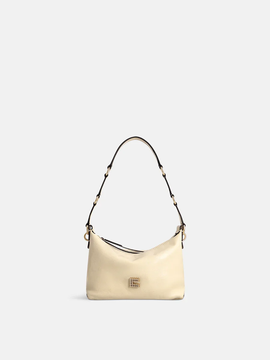 Légère et pourtant d’une taille idéale, elle accueille vos essentiels sans jamais vous encombrer. Portez-la à l’épaule pour une allure sophistiquée, à la main grâce à sa poignée intégrée ornée d’un anneau métallique discret, ou optez pour la liberté de mouvement avec sa bandoulière amovible et réglable.