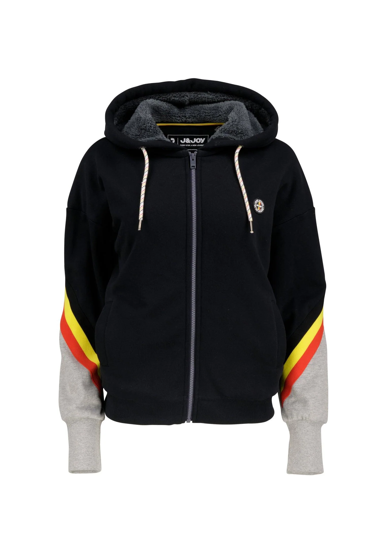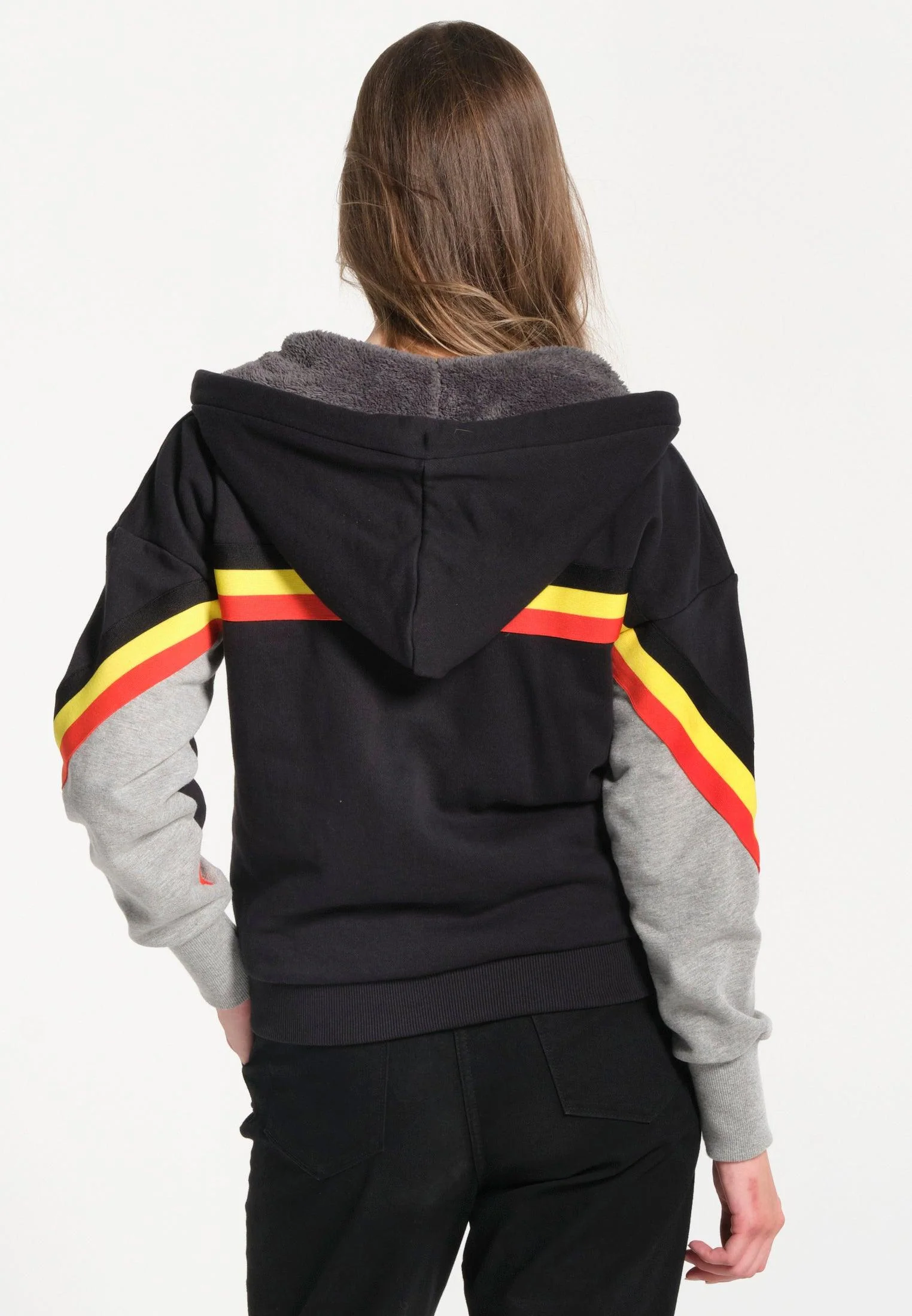 Sweatshirt femme noir zippé avec capuche et finitions noires, jaunes et rouges