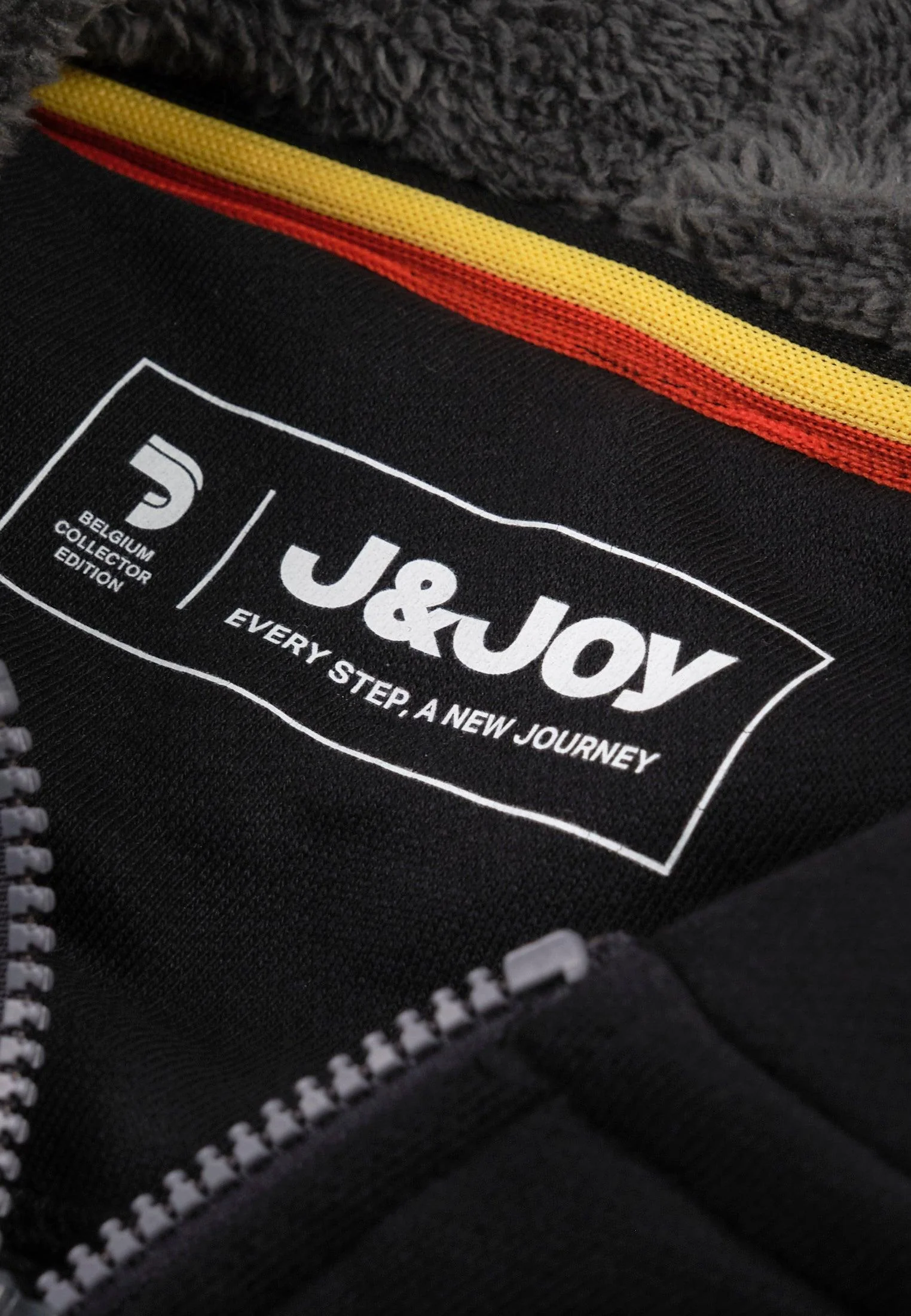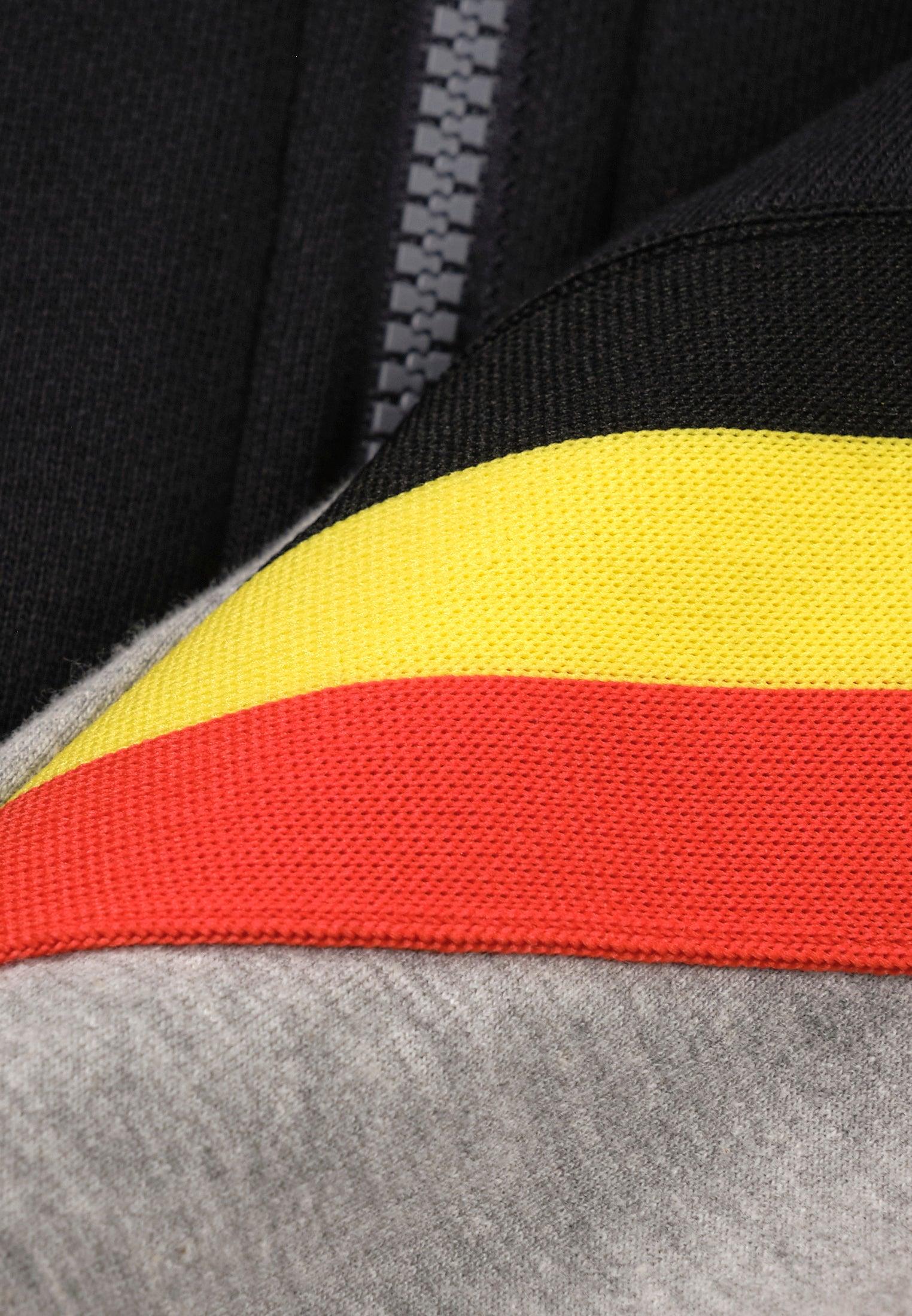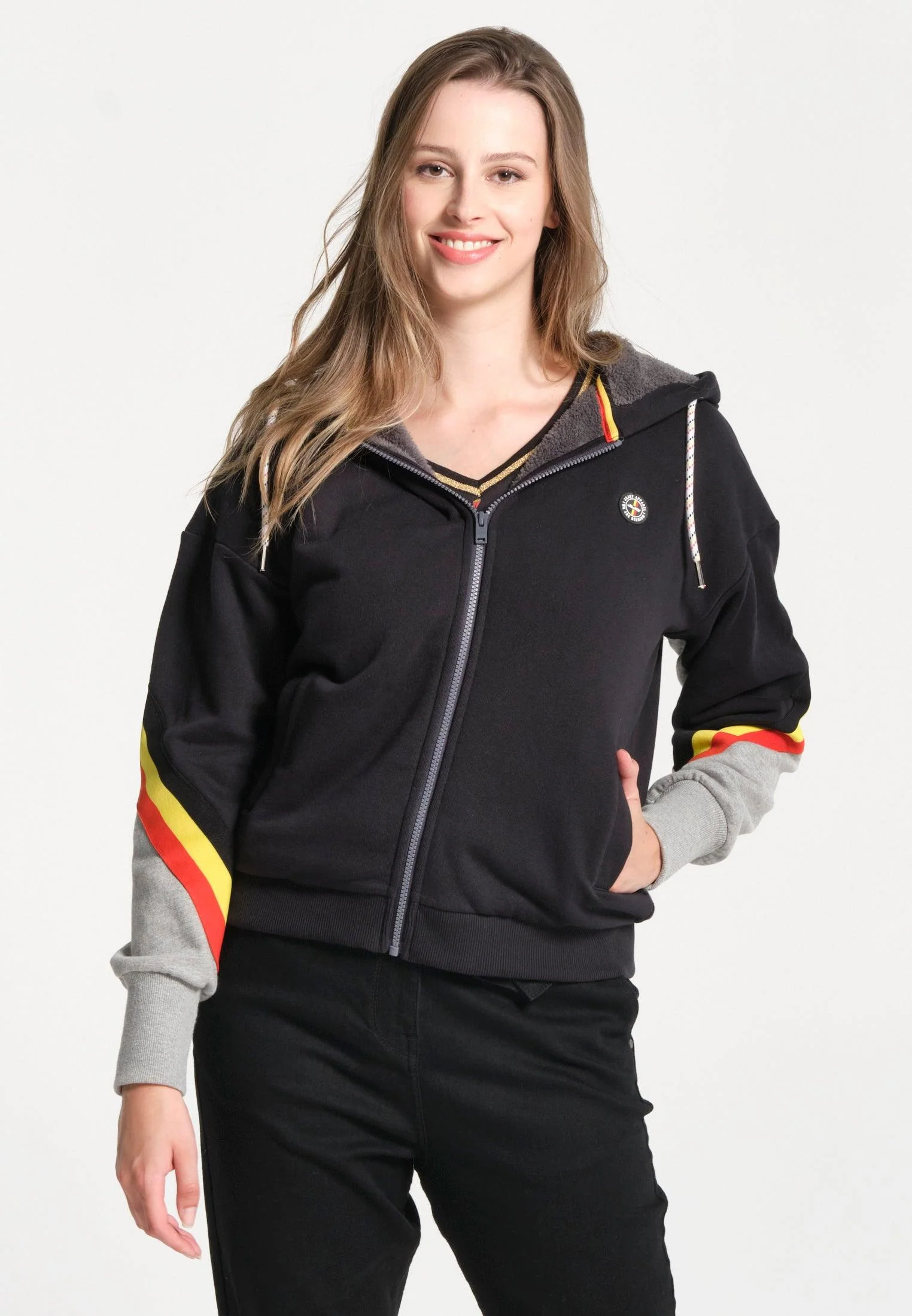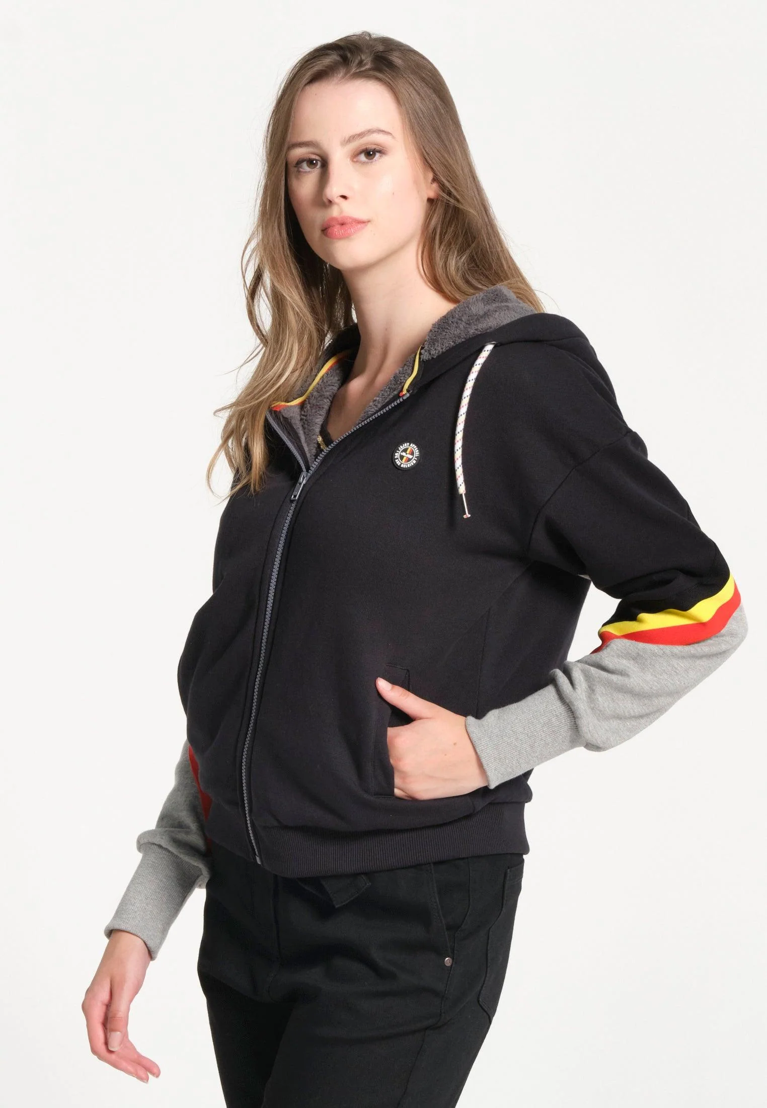 Allure sportive et décontractée avec ce sweatshirt style gilet à capuche, noir et gris. Il présente une ouverture zippée et de jolies finitions noires, jaunes, rouges. Les poignets, la ceinture et les bords sont côtelés stretch. Supportrice de l’équipe belge, oui et avec style!